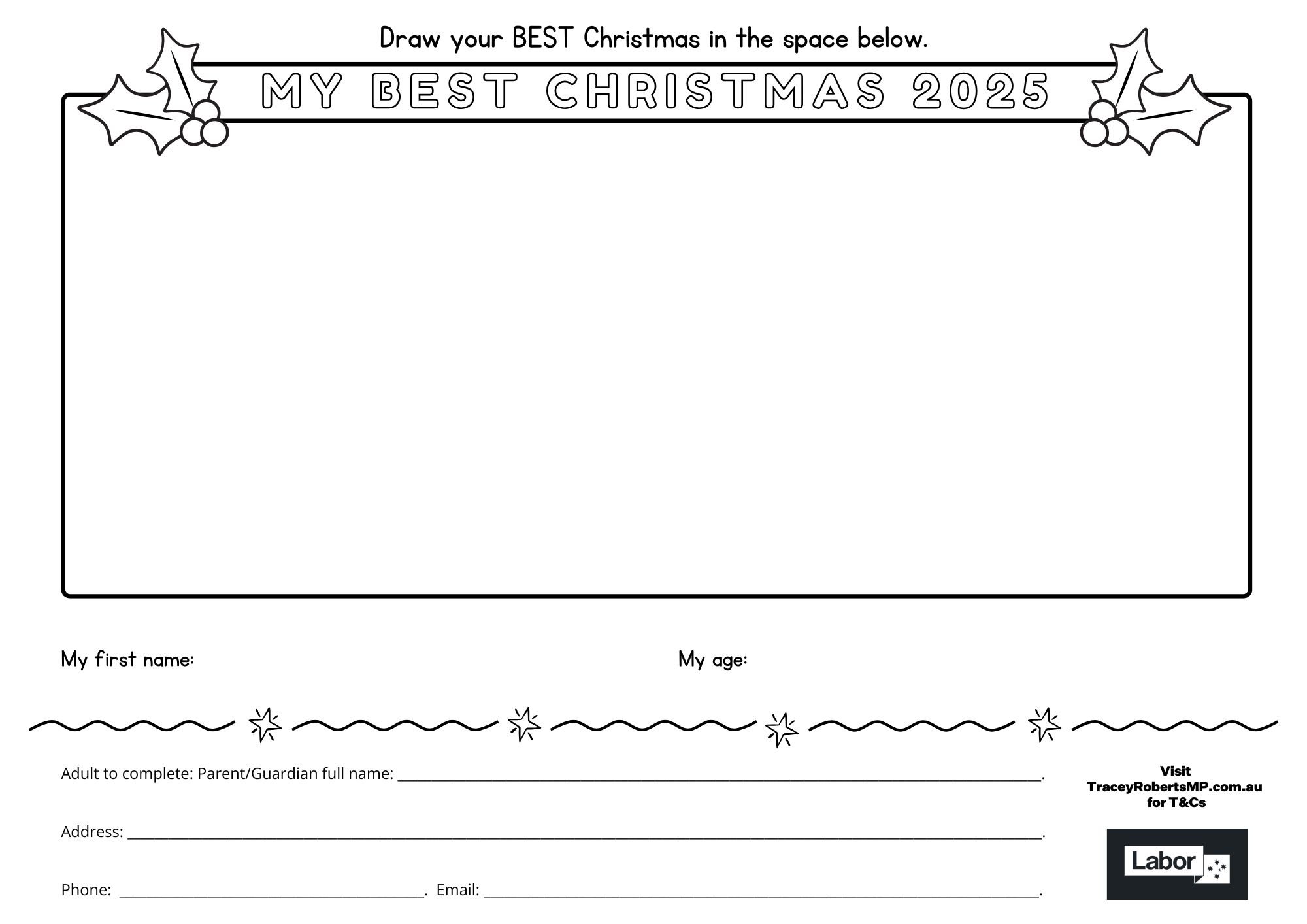 - Entrants should colour in the Christmas illustration on the Tracey Roberts MP Christmas Card Competition sheet, available to download at https://www.traceyrobertsmp.com.au/community/christmas-colouring-in-competition/)